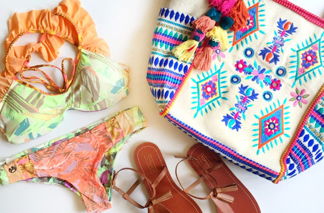 reversible oil paint palette bikini top [Use code CANDY for 10% off, wearing a medium, I’m a 34D and probably could have done a large but man, this suit is so stinkin’ cute!] // reversible oil print palette bikini bottoms [use code CANDY for 10% off, wearing a size small] // embroidered pompom tote [matching clutch available here] // tassel sandals [wearing size 8.5 as they only come in 1/2 sizes]