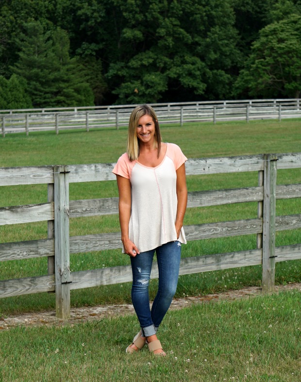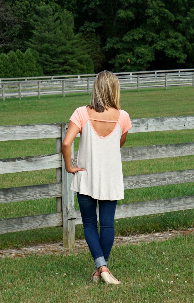 For this month we decided to go back to the basics but with a twist [or at least an open back-ish]. When I saw this top I knew it looked super comfortable and easy to wear [both of which are true] but then when I saw the back I was all “ooooooooooh yeah baby”. I’m a sucker for some fun and this shirt has some of that fun stuff going on. With the pink sleeves and stitching down the front it turns this casual tee into a feminine fiesta [just go with it].