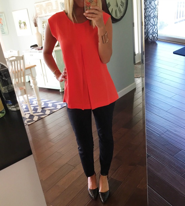 pleated cap sleeve top [wearing a small, LOVE this top for work or play – see below! available in 4 colors, great quality!] // ankle pants [use code 9497 for 15% off] // ankle strap pumps // cuff bracelet