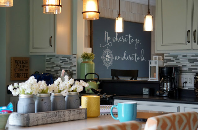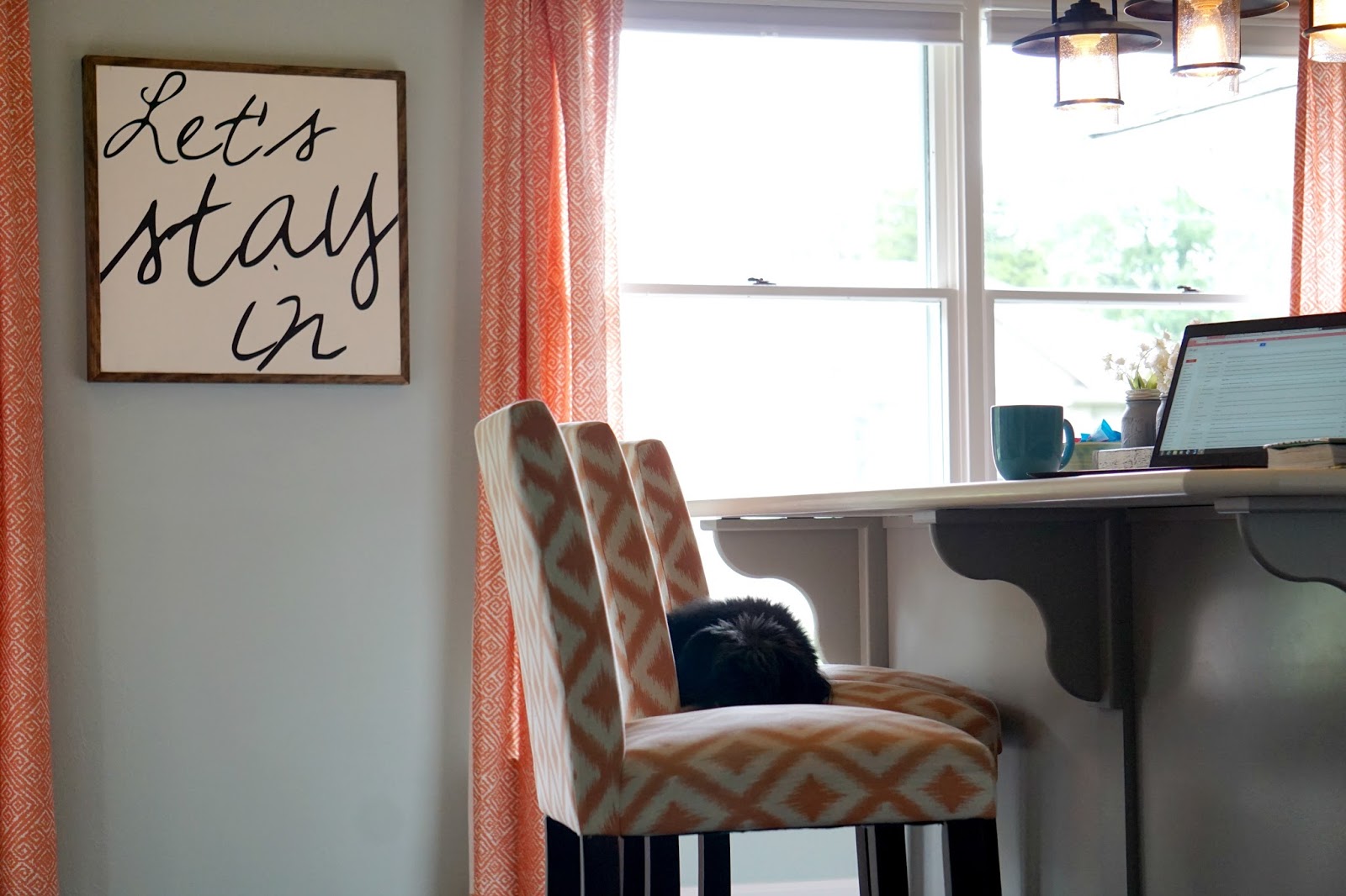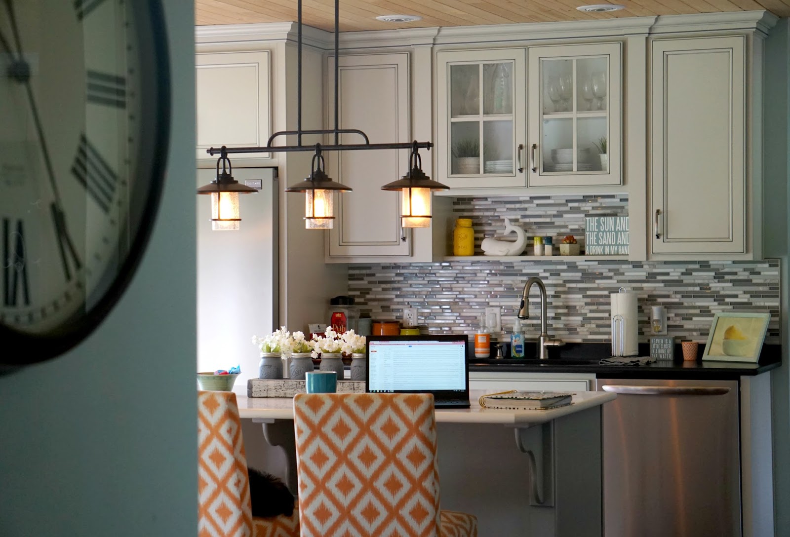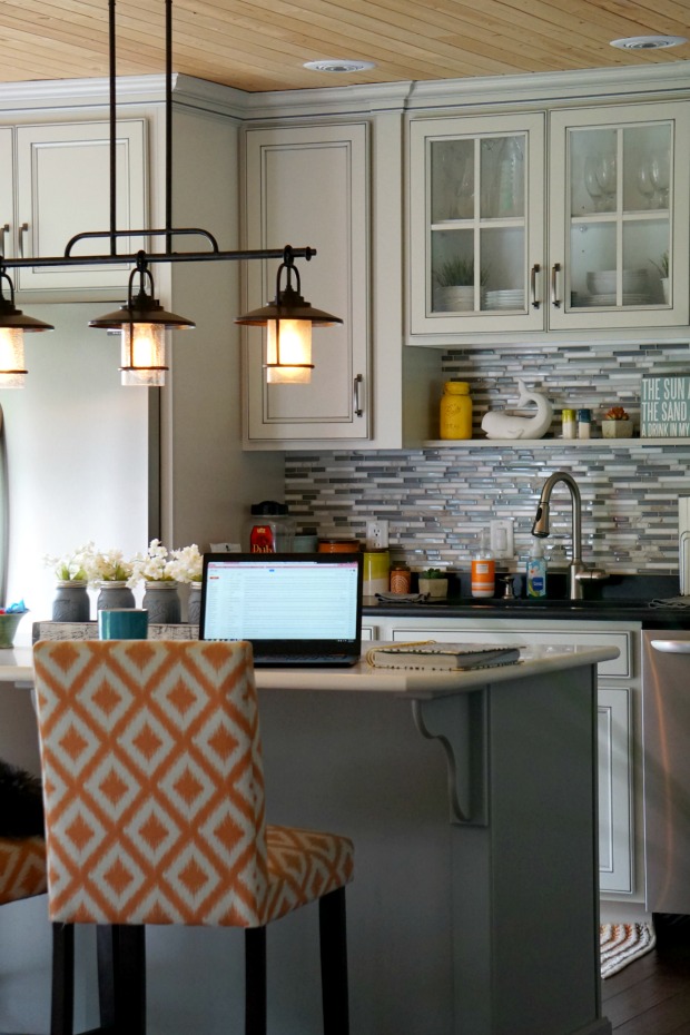 Depending on the weather you can either find me propped up at the center island in our kitchen or if it’s nice out [this morning was rainy] I will be outside on our back patio underneath the umbrella.