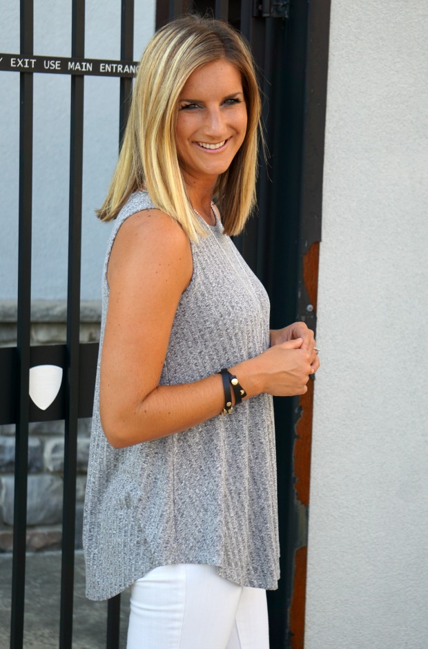 This grey tank is probably one of the easier tops I’ve ever owned to wear. No special bras needed, no camis underneath required, it’s just easy and while your mama always taught you to be the opposite, today I am saying embrace it. The fun factor comes on the backside where a row of the cutest little buttons are hanging out. The top itself doesn’t actually button up the back [so no worries about it opening up and showing your back!] but just has them stitched on for a nice little touch.