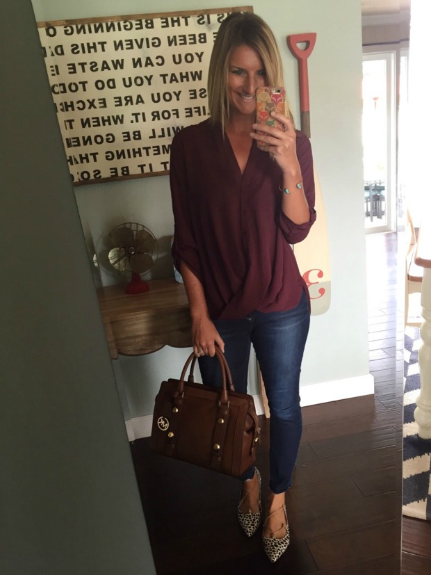 button up twist front top [true to size, wearing in small – available in 5 colors, under $50 – love this!] jeans // purse // flats // available in other color and print options here