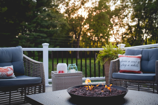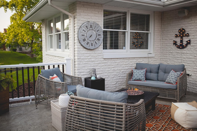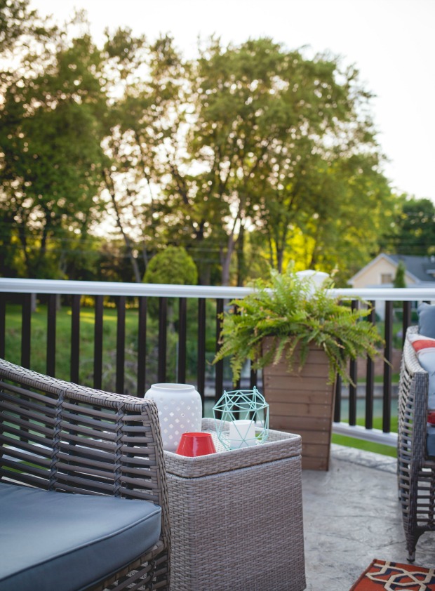 this post where I did a sneak peak into our new patio earlier this spring where I shared what it looked like before. It’s amazing what some concrete and patio railing can do for one’s appearance and soul. I am so thankful that we decided to make a great outdoor space for us to spend time on as we certainly have taken full advantage of the extra space. Lets take a peak shall we?