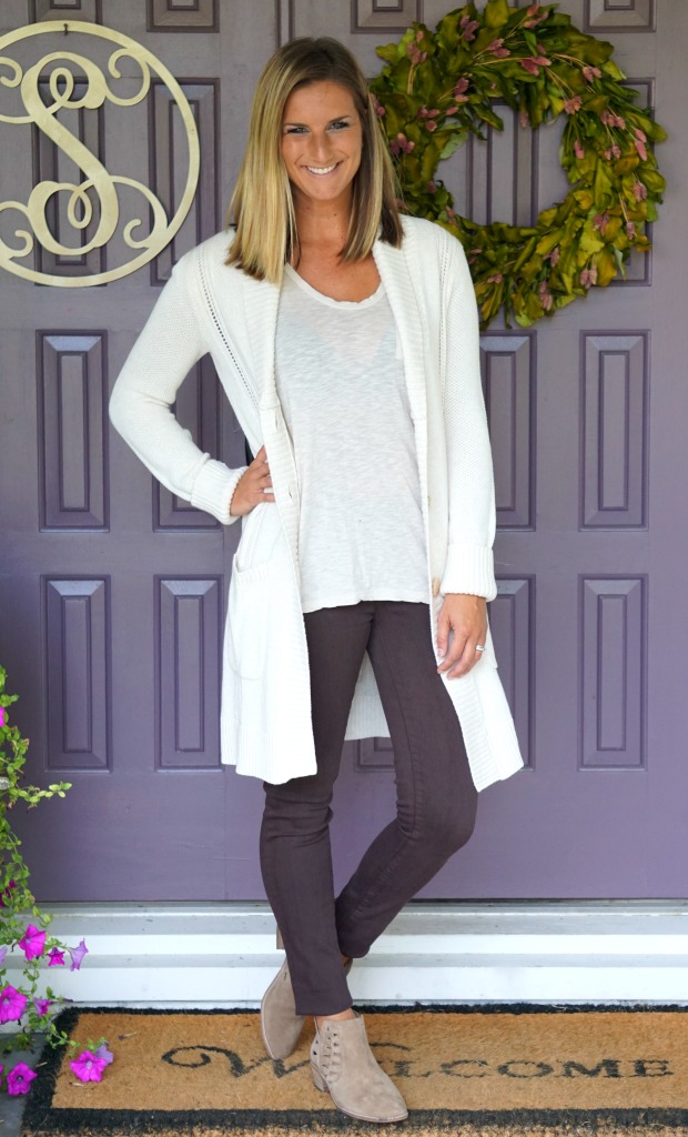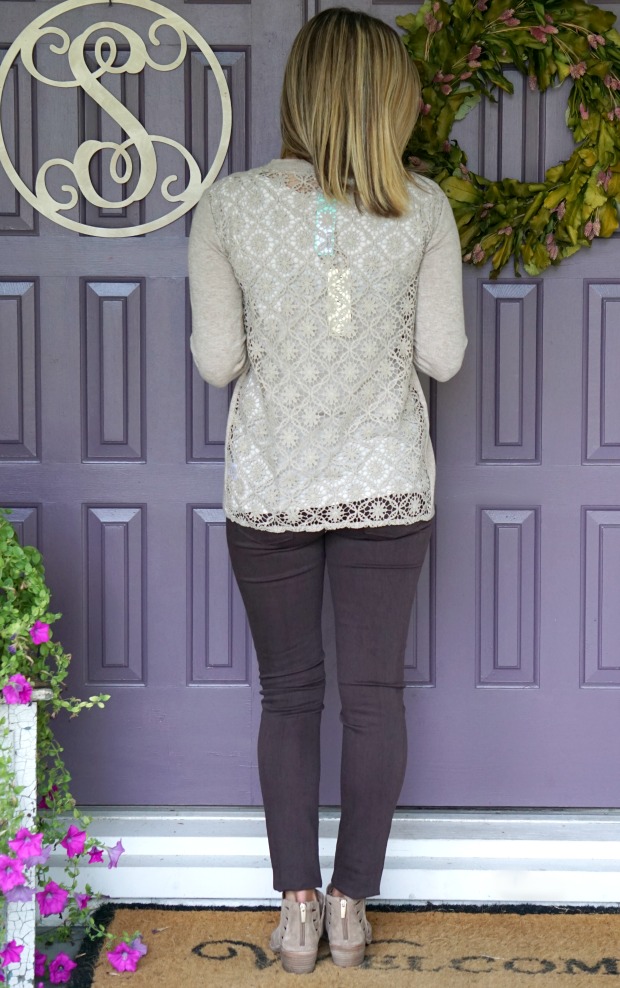 Okay so this cardigan is really cute – the lace back is pretty stinkin’ adorable, however I have been knee deep in buying cardigans of my own and while I do like this one, the color doesn’t do a whole lot for me. Maybe it’s the color of the tee that I paired with it but it looks a little drab on me. Maybe pair it with a punchier color for a little more pizzazz.