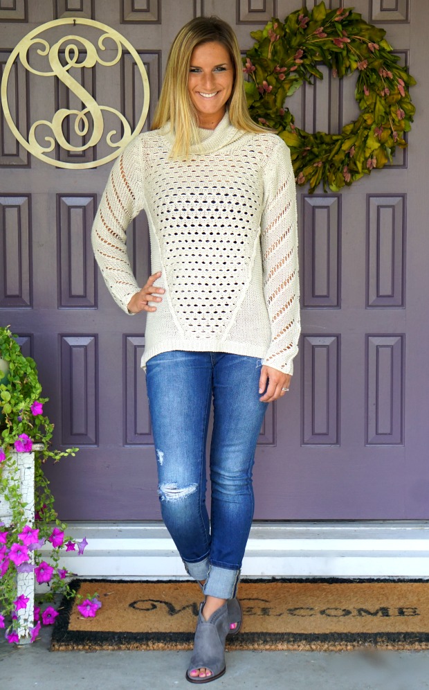 If I was ever born in the form of a sweater, a cowl neck it would be. I am obsessed with cowl necks as they are so comfy/cozy. While all of the holes in the sweater may not be the most logical of choices for really cold months, I will wear it all fall long with a simple cami underneath. The color is super versatile – paired with grey, tan, black – it all works. Yaaaaaaaaaaaaay for sweater weather.