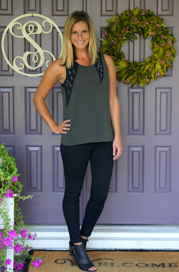 So here’s the thing with this top – I love the color, olive is my jam. The black areas with the grommets did give it some fun edge, however the main reason I sent it back is because I have a TON of sleeveless tops and hardly ever wear them so it seems. Now, would this be great under a jacket for fall? Yes. So why didn’t I keep it now that I think about that? Well crap, I don’t know. Oops.