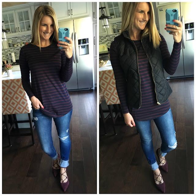 Striped tee [under $20, I would consider sizing down one] // Jeans [size down if in between, these are incredibly soft! more sizes here] // flats [wearing in Bordeaux suede, 20% off!]