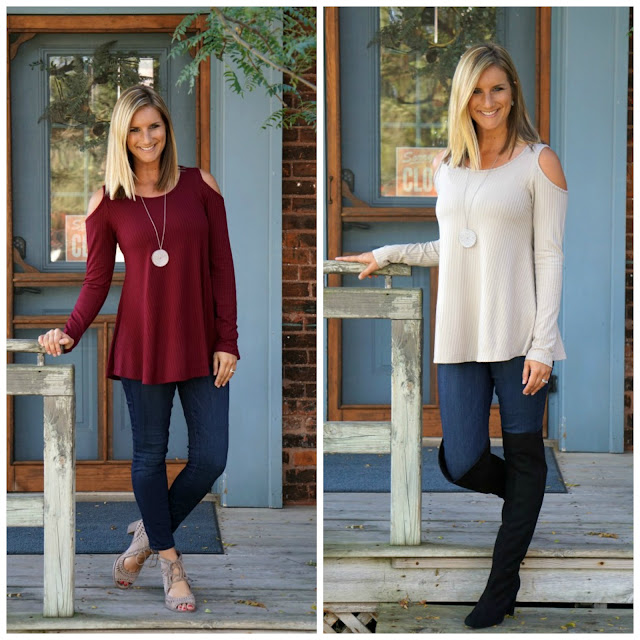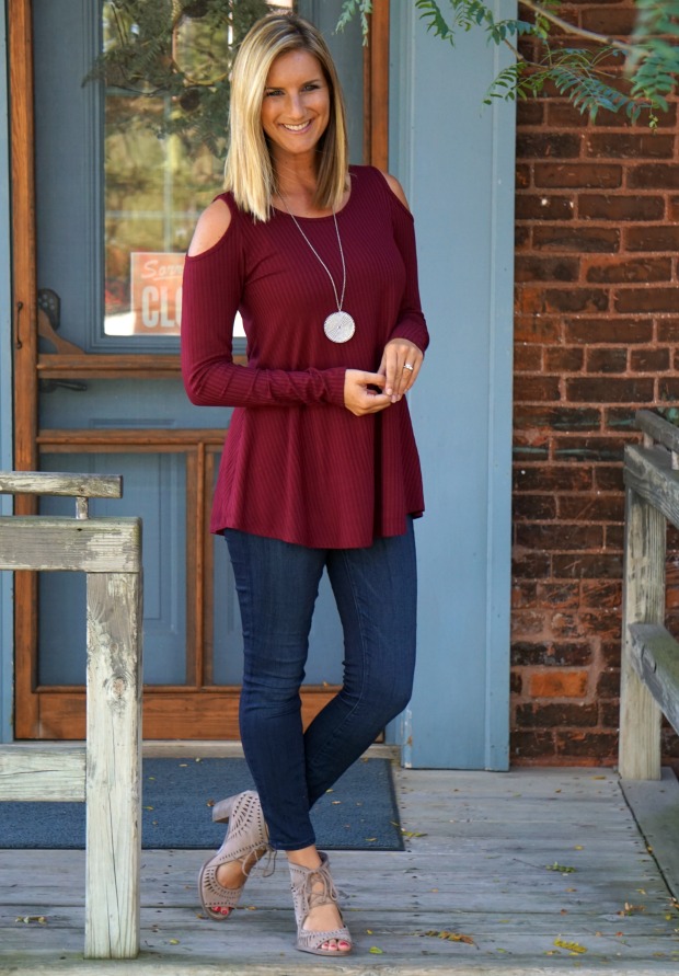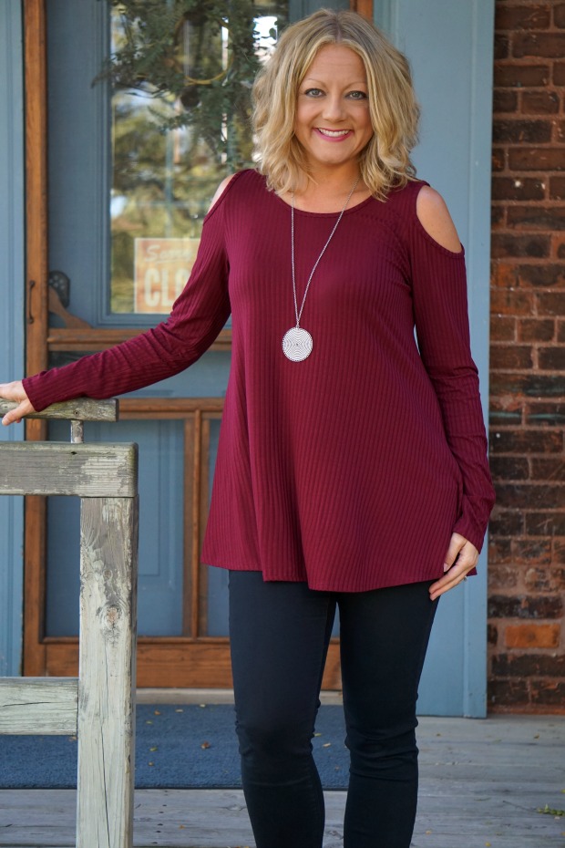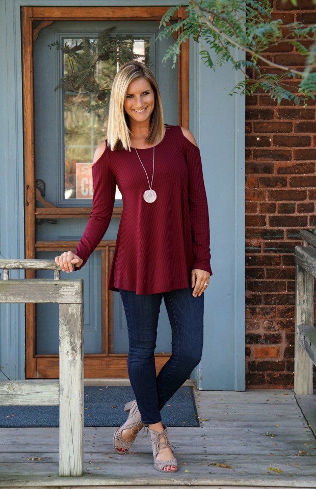 For this month’s choice, we opted for the oh so popular cold shoulder look. Here’s why I love it – you get to look a little spicier than normal while not revealing too much and the best part – YOU GET TO WEAR A NORMAL BRA IN THE PROCESS! While I love off the shoulder looks, strapless bras can be a little make you want poke your eyeballs with a fork-ish. However, with this top you not only look cute, you feel comfortable. Especially when the top itself is this ribbed, flowy, comfy, lightweight material that feels so good on. As you can see we went with two top color options for fall and winter – wine and taupe. Again, it’s up to you which one you choose!