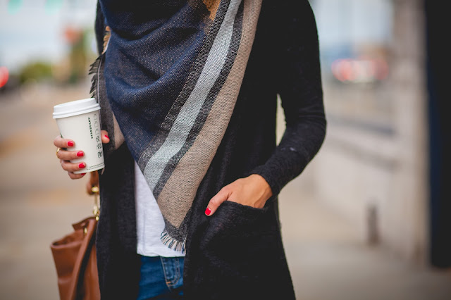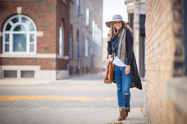 I love everything about this outfit mostly because it just oozes cozy and makes me feel like a walking billboard for fall. To achieve this look I simply threw on a pair of distressed jeans, white long sleeve top, and high-low cardigan. I then proceeded to top it all off with a floppy hat, geometric scarf, handbag, and of course, ankle booties. Because these jeans are a little too long for me to wear regularly [I’m 5’4 for reference] I simply cuffed them up twice as you can see. Grabbed my beloved caramel apple spice and look complete!