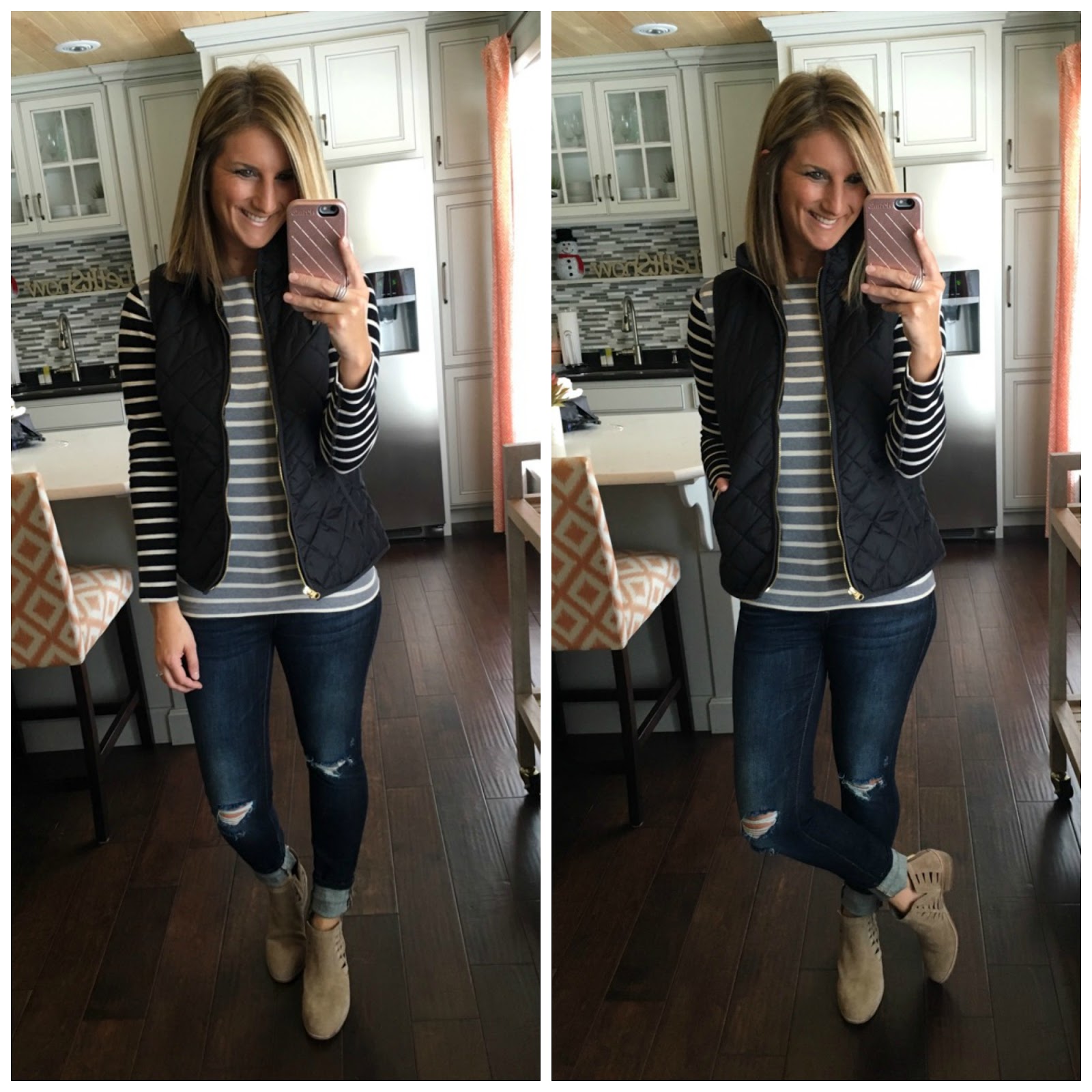 20. J.Crew top [use code GIFTNOW to get it for $11.99] // Vest similar [under $20] // Blanknyc Skinny Jeans [19% off] // Vince Camuto Booties [10% off]