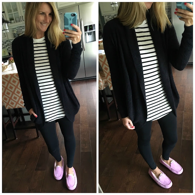 10. Barefoot Dreams Circle Cardigan + BP Striped Shirt [40% off] + Zella Regular Leggings + UGG Ansley Slippers