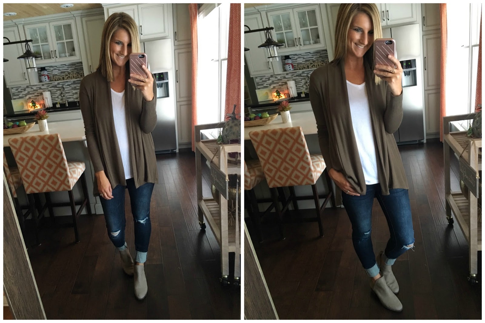 Sizing info: Cardigan – size down 1-2 sizes, wearing in XS // tee: true to size, wearing in small // jeans: true to size // wedges: true to size
