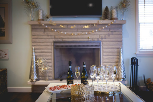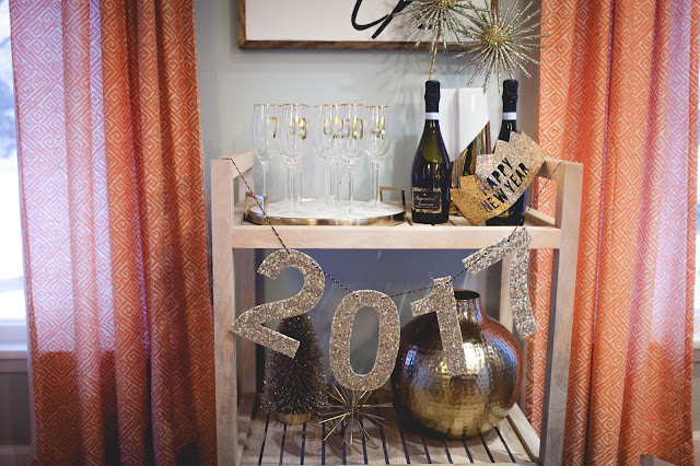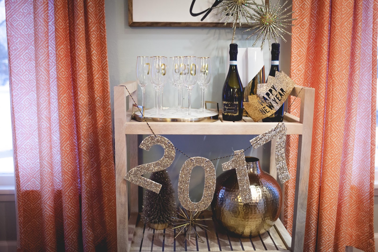 As you can see from below, I simply swapped out my ornament wreath and other seasonal decor and placed these fun countdown champagne flutes, gold starburst stems inside a gold dipped vase and waaaaa-la. Pour yourself a glass and have fun!