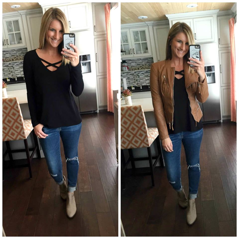 Top [love this! true to size, wearing in small] // Black jeans [true to size]