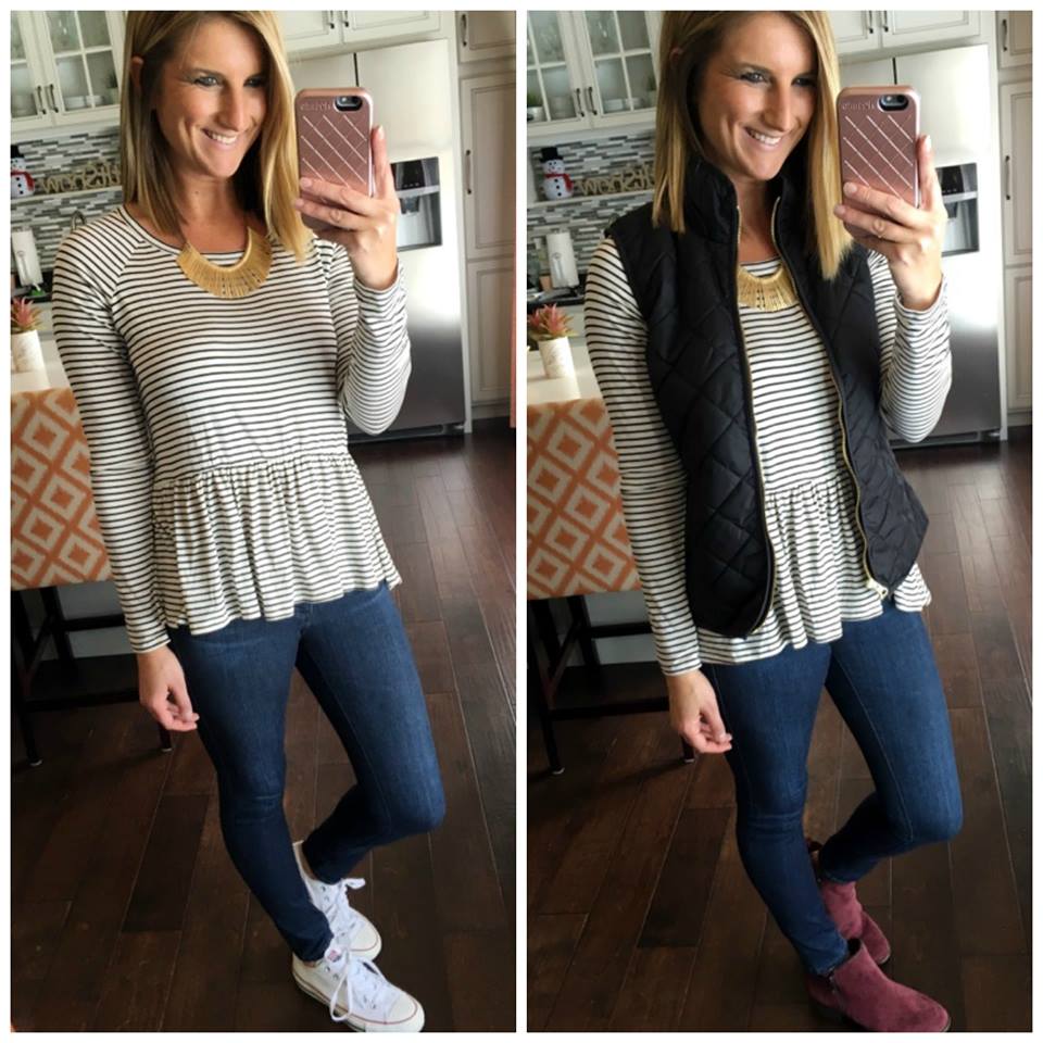 Peplum Tee [size up if in between, wearing in small] // jeans [true to size] // converse [size down .5 size] // black vest – less than $13 [true to size, wearingin small] // beet booties – 15% off [true to size]