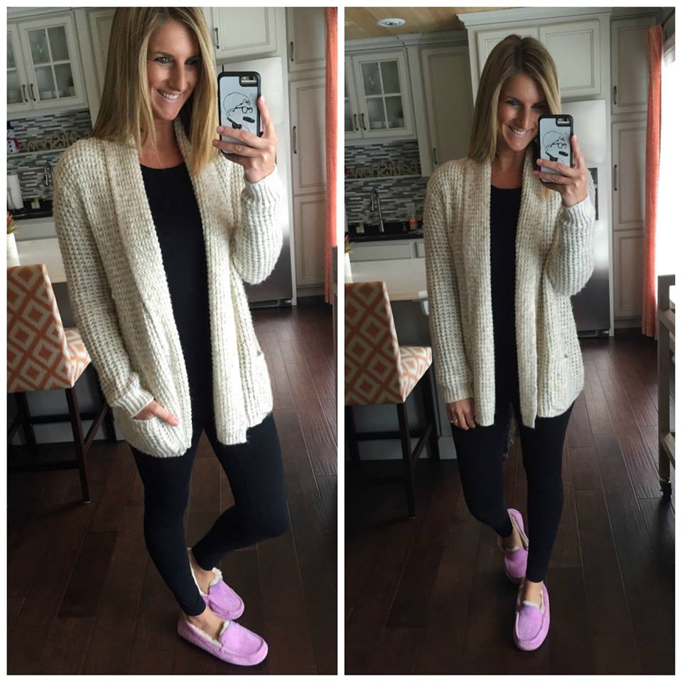Black long sleeve tee [true to size, wearing in small] // High waist leggings – available in other colors [true to size, wearing in XS] // Slippers [if in between, go up]