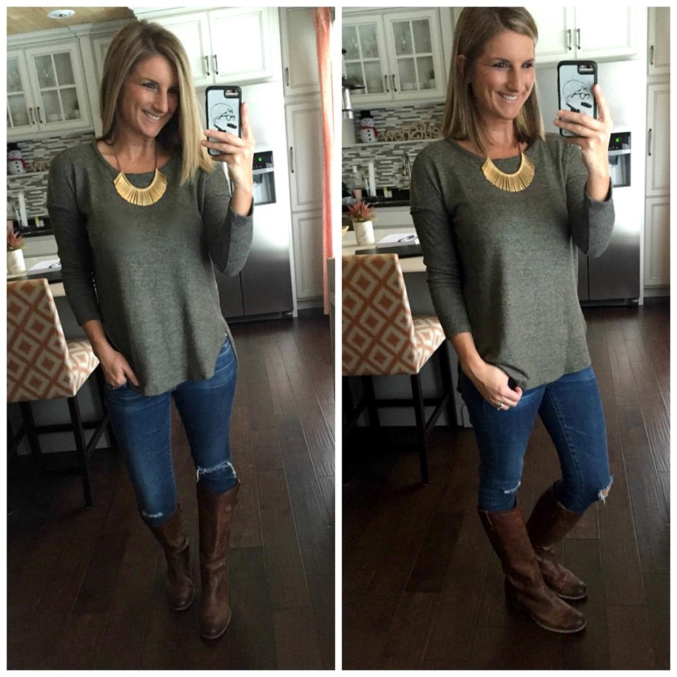 Top – 33% off, available in many colors [if in between, size up – wearing in XS but almost could have done a small] // Jeans – 19% off! [true to size] // Boots [wearing in cognac, true to size] // Necklace
