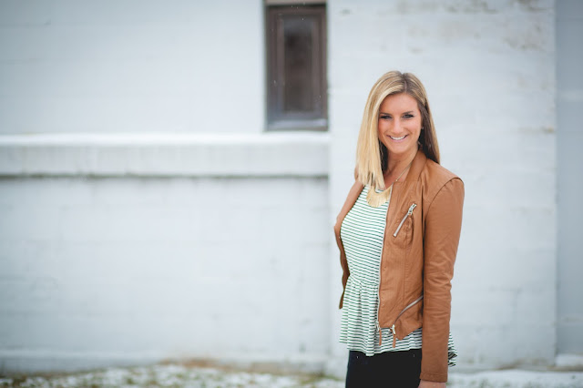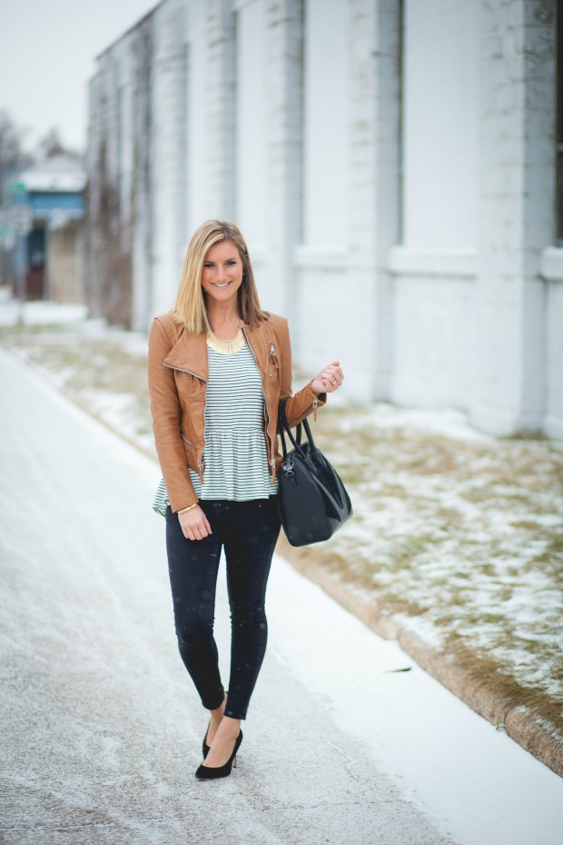 For the next look, I went with a little more layered option because if there is one thing this girl loves, it’s layers. Because I am a rebel, I mixed it all up with black, brown and gold tones. By taking a peplum tee and pairing it with an edgy faux leather jacket, it’s a fun way to play off two different vibes.
