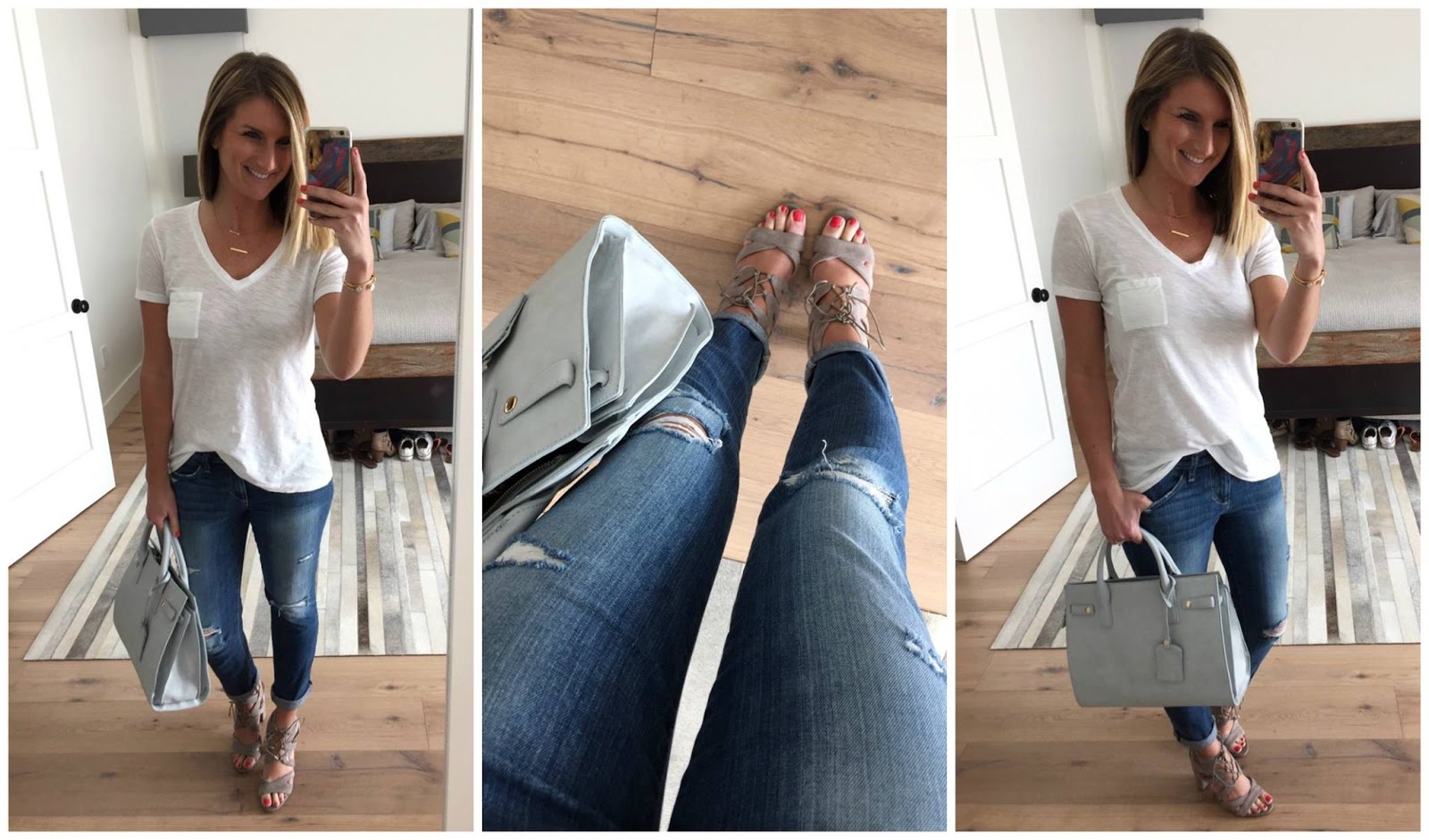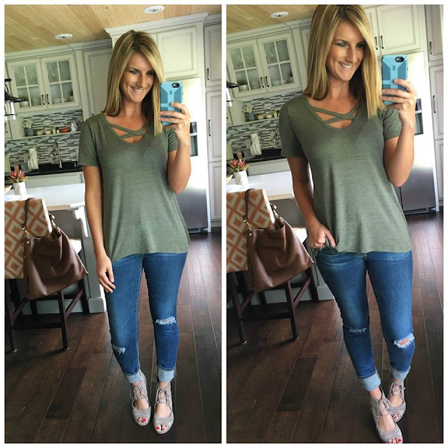 strap front tee [under $30, if in between size down – wearing in small for a looser fit] //