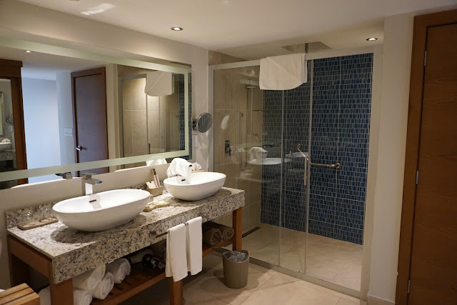 When booking our room the only category that was left was the Sunset Butler Suite so we bit the bullet and did it. The size of the room was awesome with a separate sitting area with a couch and chairs, comfortable king size bed, balcony large enough to eat our breakfast at every morning, a huge bathroom with probably our favorite walk-in shower [the water pressure was excellent] and the largest bathtub I’ve ever been in. The room also had a mini-fridge, a wine fridge, etc. The only thing it was lacking were outlets next to the bed [maybe that’s just a pet peeve of mine]. While it made you feel slightly fancy to have a butler, we actually didn’t use them really for anything. The resort provides you with a cell phone that you can reach your butler at any time during the hours of 7 am – 10 pm, but other than asking for a bottle of Captain Morgan and booking our massage, we didn’t utilize them for anything else. While I wouldn’t pay for the butler aspect of it again, I would pay for the location of the room again. We had an amazing view from bed of the ocean and it also overlooked one of the resort pools and the main resort restaurant, Azul. We could sit and watch cruise ships float on by, airplanes fly overhead, and even witness a proposal! The resort also offers several swim-up rooms on the ground floor, however, it didn’t appear that many people actually used them. If I were to advise you on a room I would recommend a higher floor so you can have more of a view!