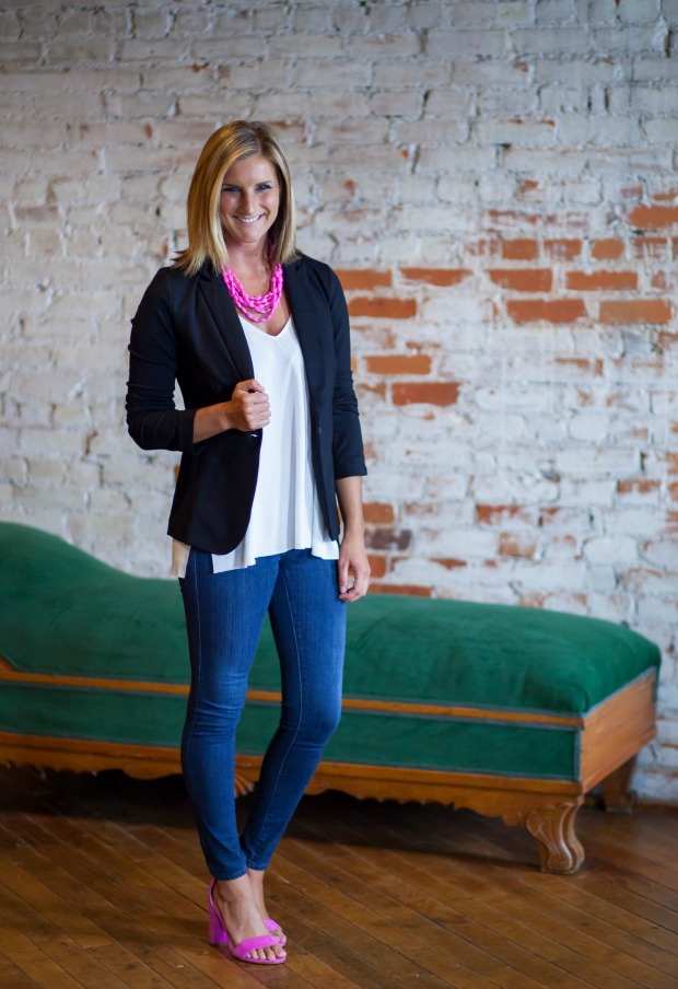 To keep things a little less office-y and a little more fun, I paired the blazer with a comfy yet little bit sexy v-neck swing tank, skinny jeans and my favorite ankle strap heels in bright pink. This is a great date night or girls night out outfit that will never go out of style.