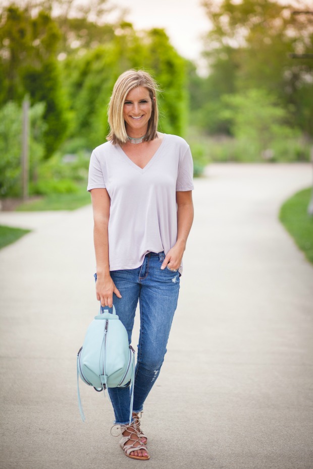 Lush V-Neck Tee [true to size, wearing in small] // Sp Black Frayed Hem Skinny Jeans [true to size] Rebecca Minkoff ‘Medium Julian’ Backpack // Treasure & Bond Stone Fringe Choker Dolce Vita Juno Sandal [true to size]