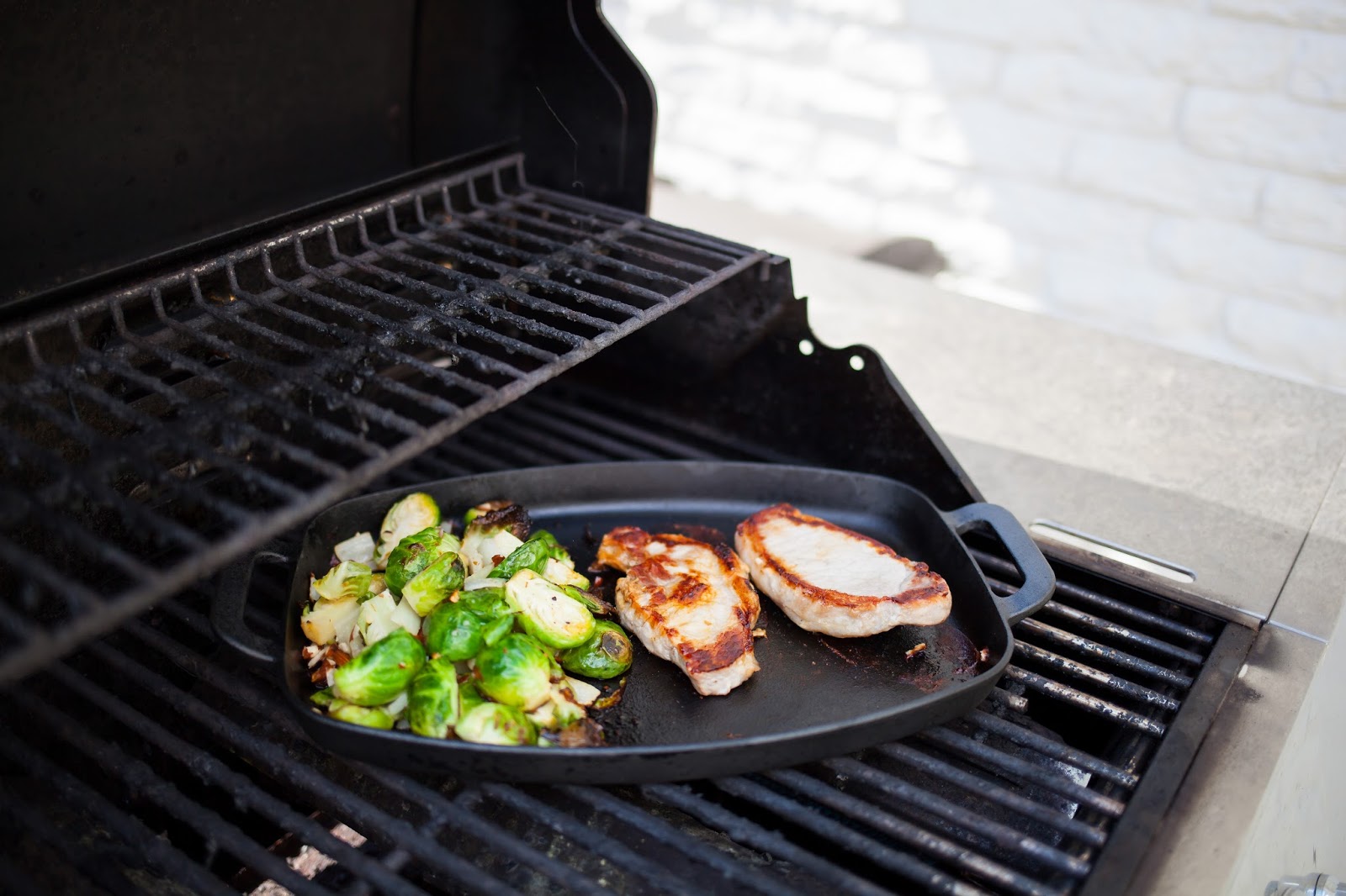 3. Add both to your cast-iron pan and throw on the grill! Stir Brussels Sprouts occasionally and flip pork chops until done.
