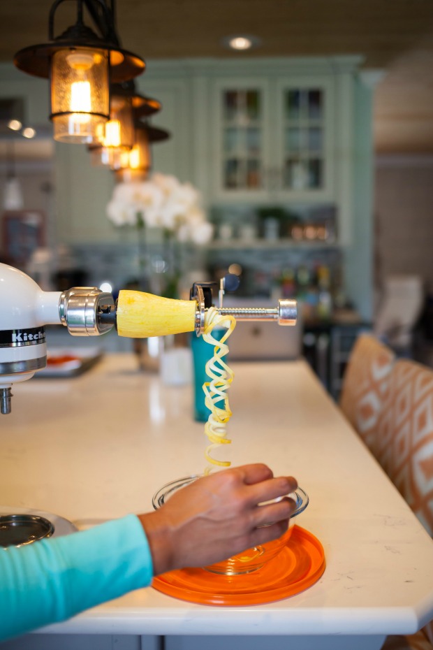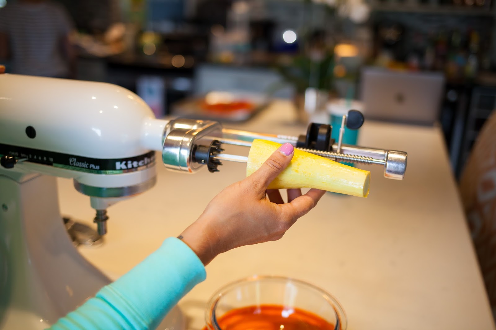 2. Spiralize your sweet potatoes [I recommend using this KitchenAid attachment!]