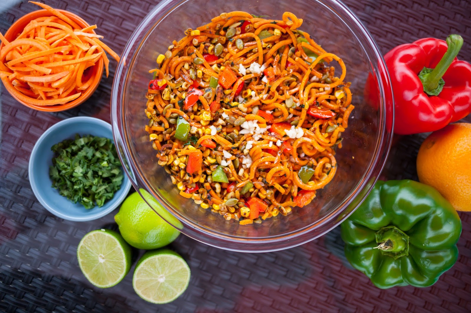 This salad bowl is made up of a base of sweet potato noodles. You read that right, sweet potato noodles. Thanks to the KitchenAid 5-Blade Spiralizer which will literally make ALL of your noodle dreams come true. Here’s the recipe: