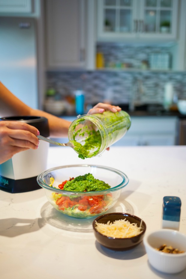 4. Make your pesto – I love using my NutriBullet to easily get this done! Simply add all ingredients and blend until pesto is complete!