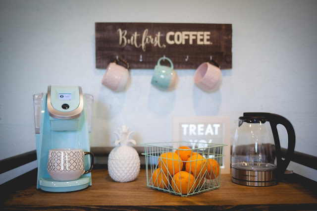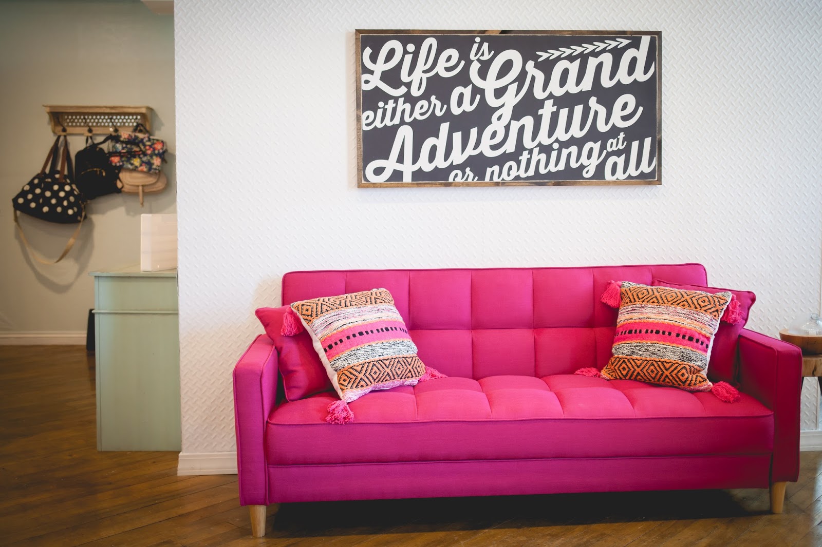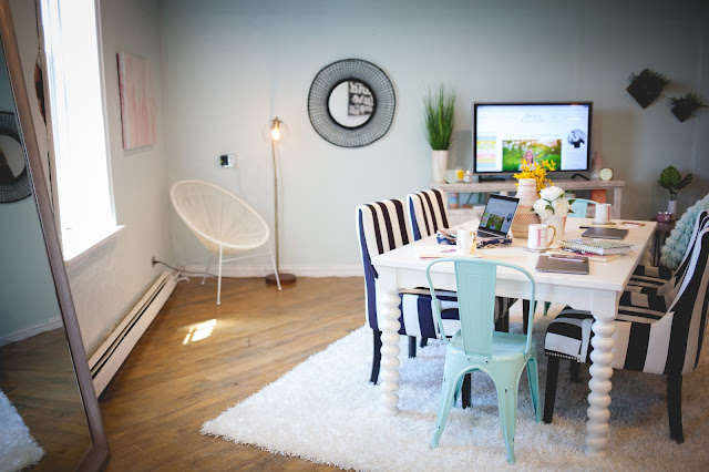 The office is inside of an old historic building in our small town and is packed with lots of character which makes showing up for work not so dreadful. The best part is that there is both a cupcake AND cheesecake shop within the same building so yeah, it’s not a place to visit for losing weight. Our space is a perfect size for us to all be able to get comfortable while small enough to keep us all within talking [or singing] distance. When deciding what I wanted the office to look and feel like I decided that I wanted it the least amount of office-y and the most amount of home-y as possible. That meant lots of comfortable seating, light colors, an oil diffuser [obvs] and coffee, lots of coffee. When it came to furnishing the space I hit up