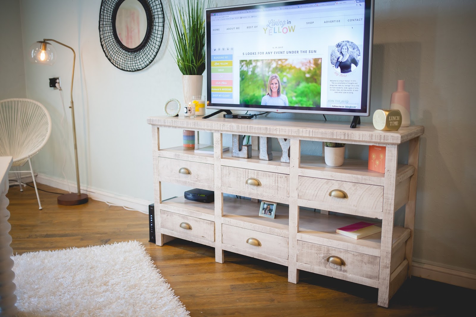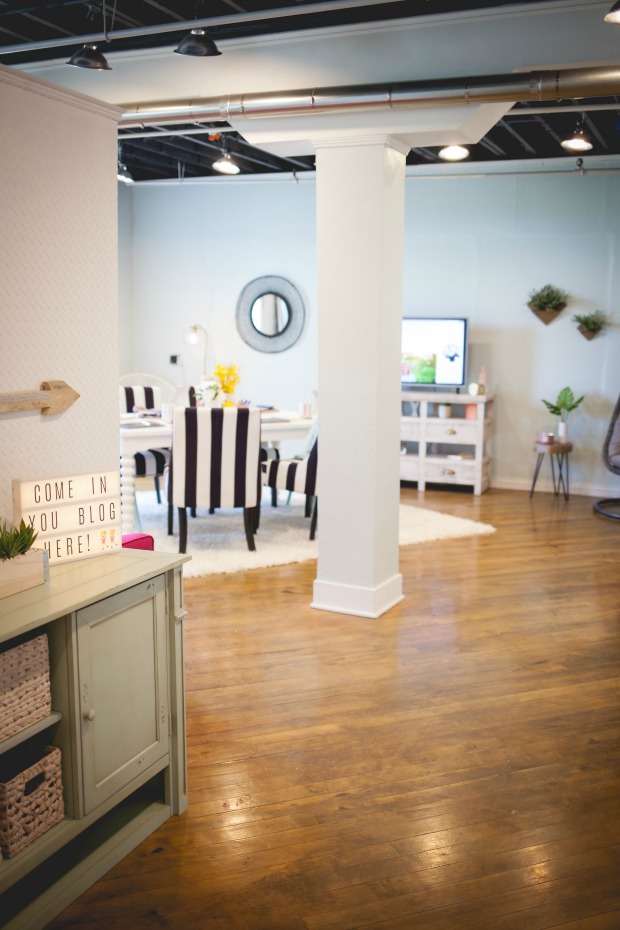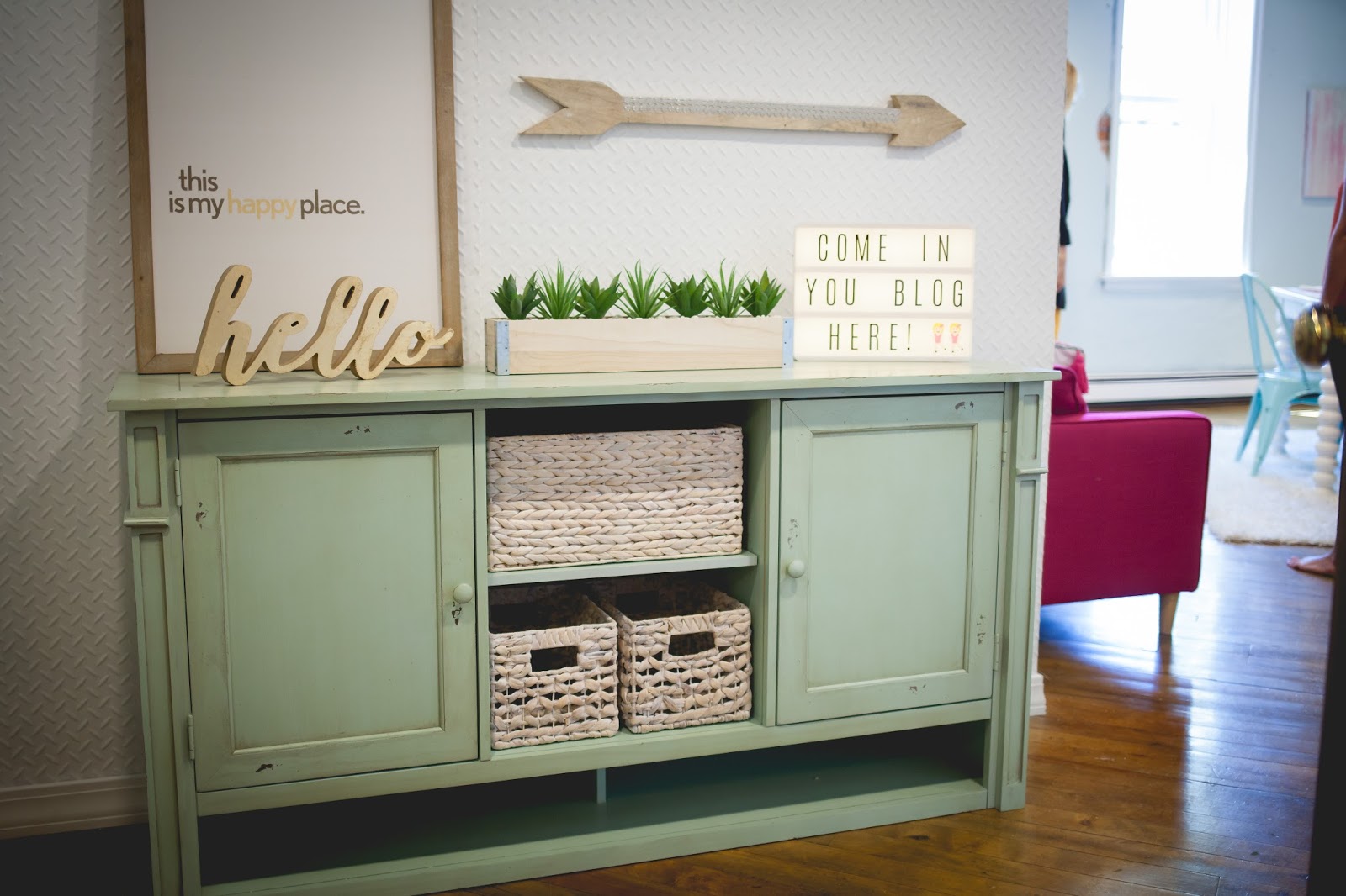 When you first walk in you are welcomed by the cutest mint TV console table [who said you can’t use a TV stand for an entry table!?] and punny marquee. Make a right and waaaa-la! You have now entered the “take off your shoes, slip into some slippers, make a cup of coffee and stay awhile” zone. We like this zone.