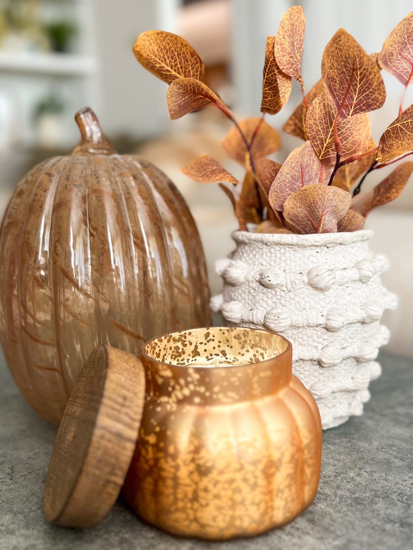 The gold detail in this Pumpkin Cheese Board is stunning! I plan to layer it with other wood cutting boards to display in my kitchen later this fall and use it for charcuterie when we host! Of course, fall decorating isn’t complete without the perfect cozy candle!