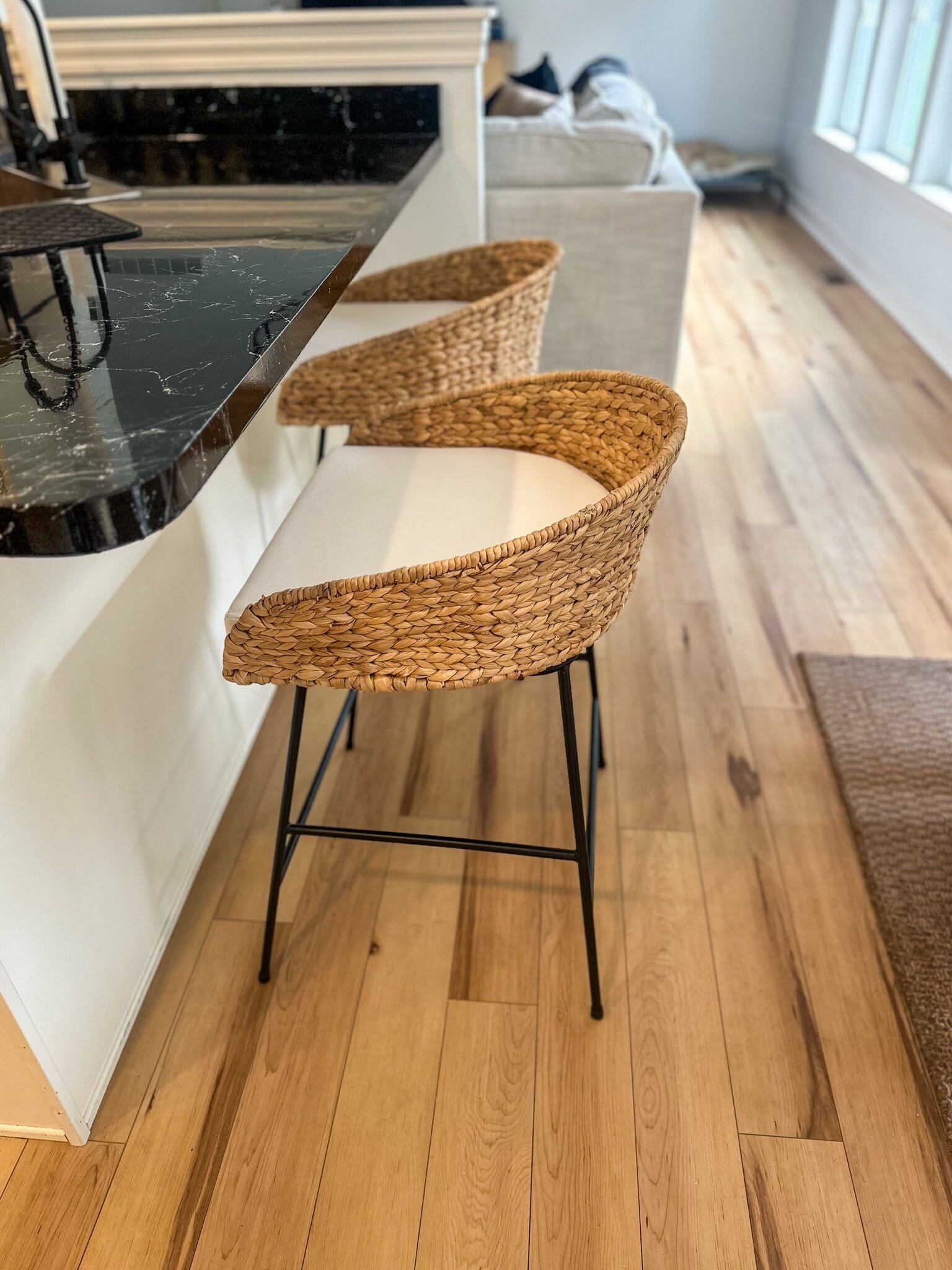 Katy here sharing my newest home purchase! I love the look of woven barstools but not at the designer prices I’ve seen. I grabbed these from Target and they were so easy to put together and I love them for our kitchen! Note: the back is not very high and the cushion is firm!