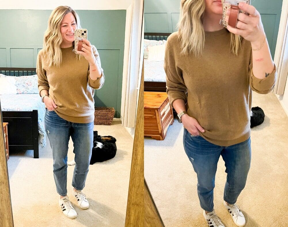 Sweater [wearing in L, TTS] // Similar Jeans [size down, wearing in a 10] // Sneakers [run slightly large, but still wearing my true size!]
