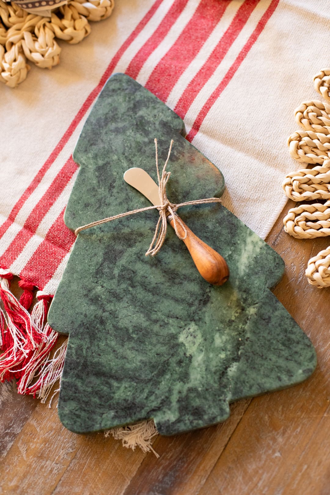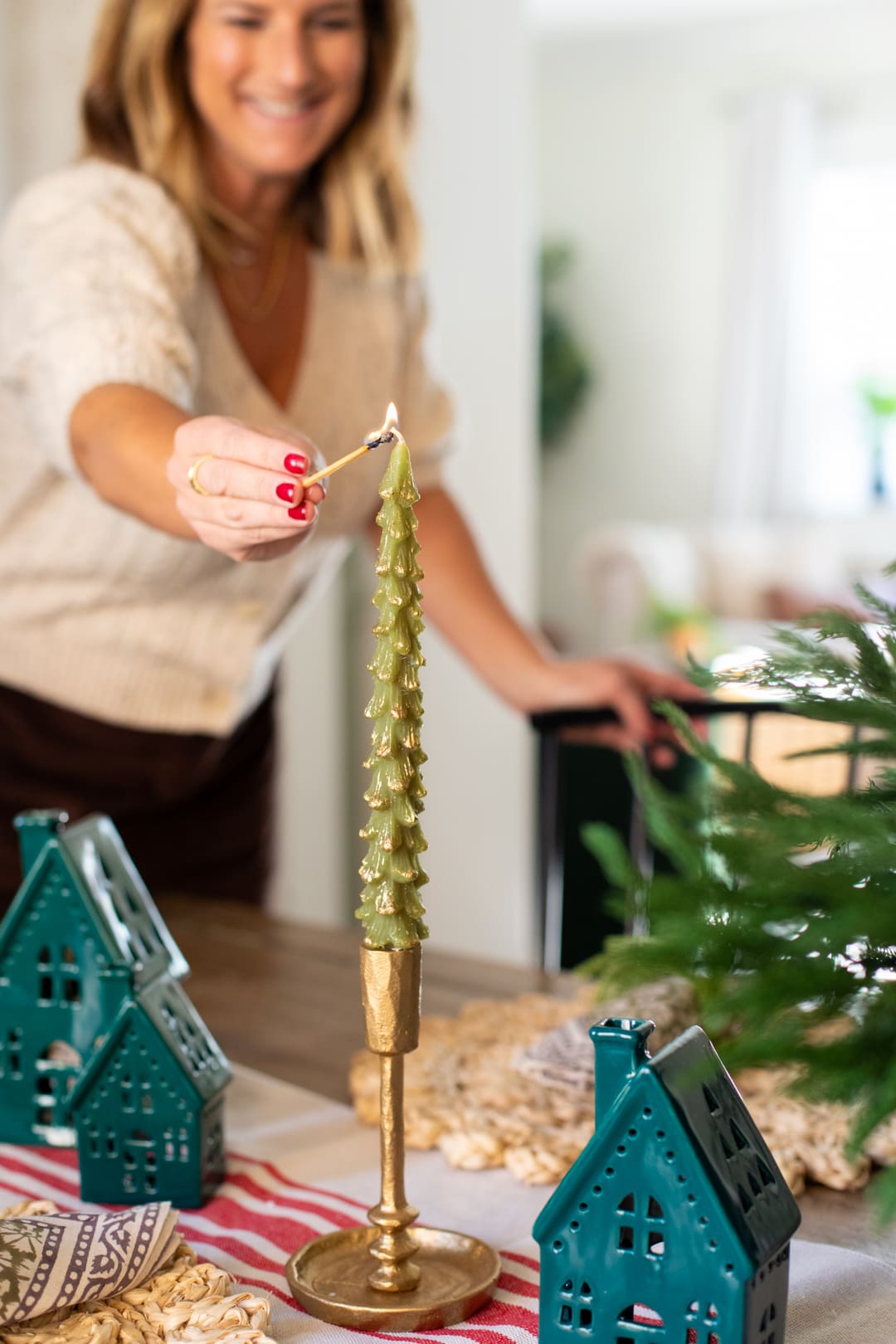 Tree Candles // Gold Candle Holders // Gold Deer // Table Runner // Placemats // Greenery // Vase // Napkins // Wreath Napkin Rings // Ceramic Houses