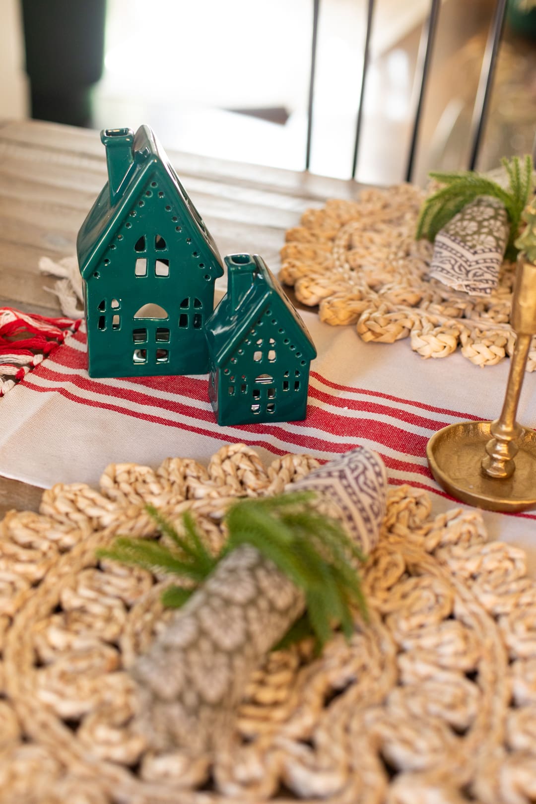 Gold Candle Holders // Table Runner // Placemats // Napkins // Wreath Napkin Rings // Ceramic Houses