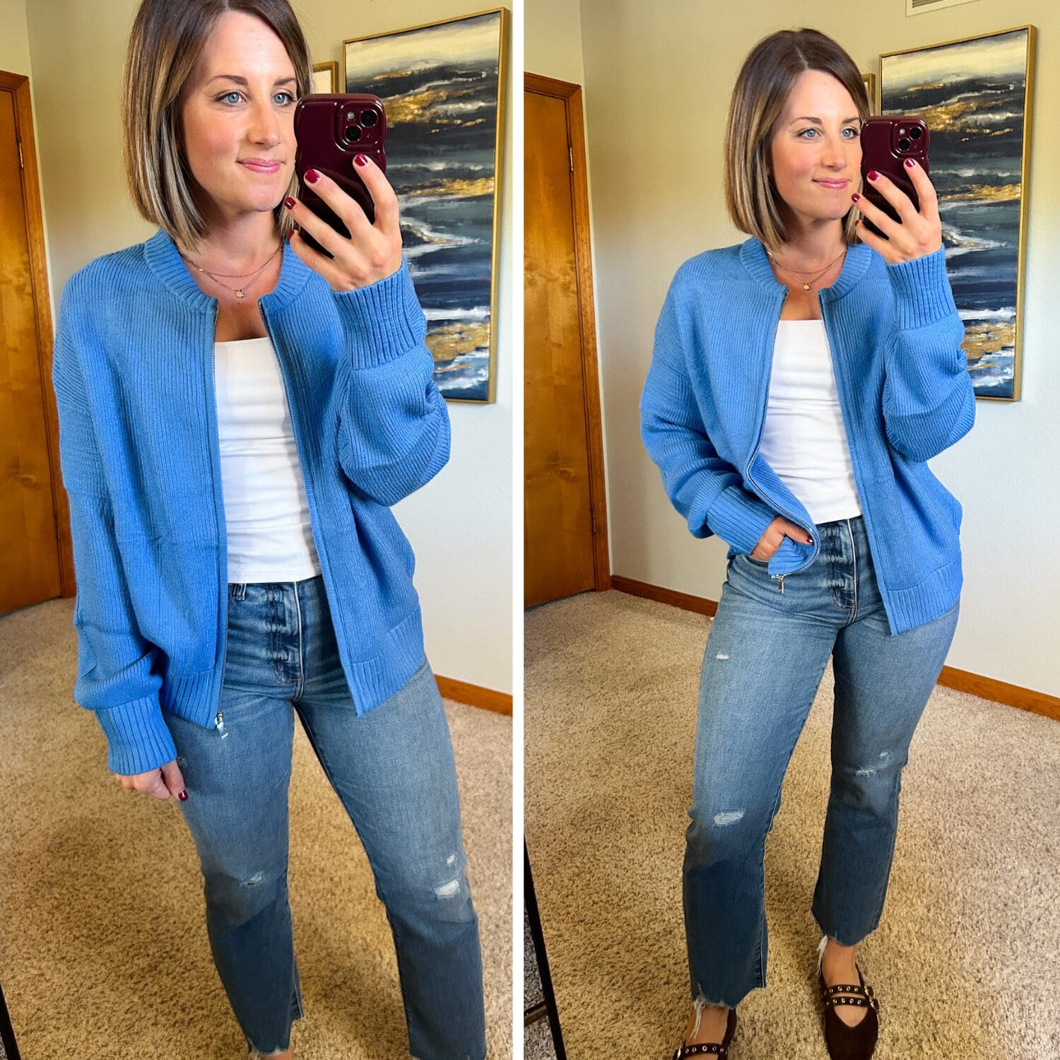 Zip Up Cardigan [True to size, wearing in Small] // Similar Tank // Jeans [size down one] // Flats [true to size]