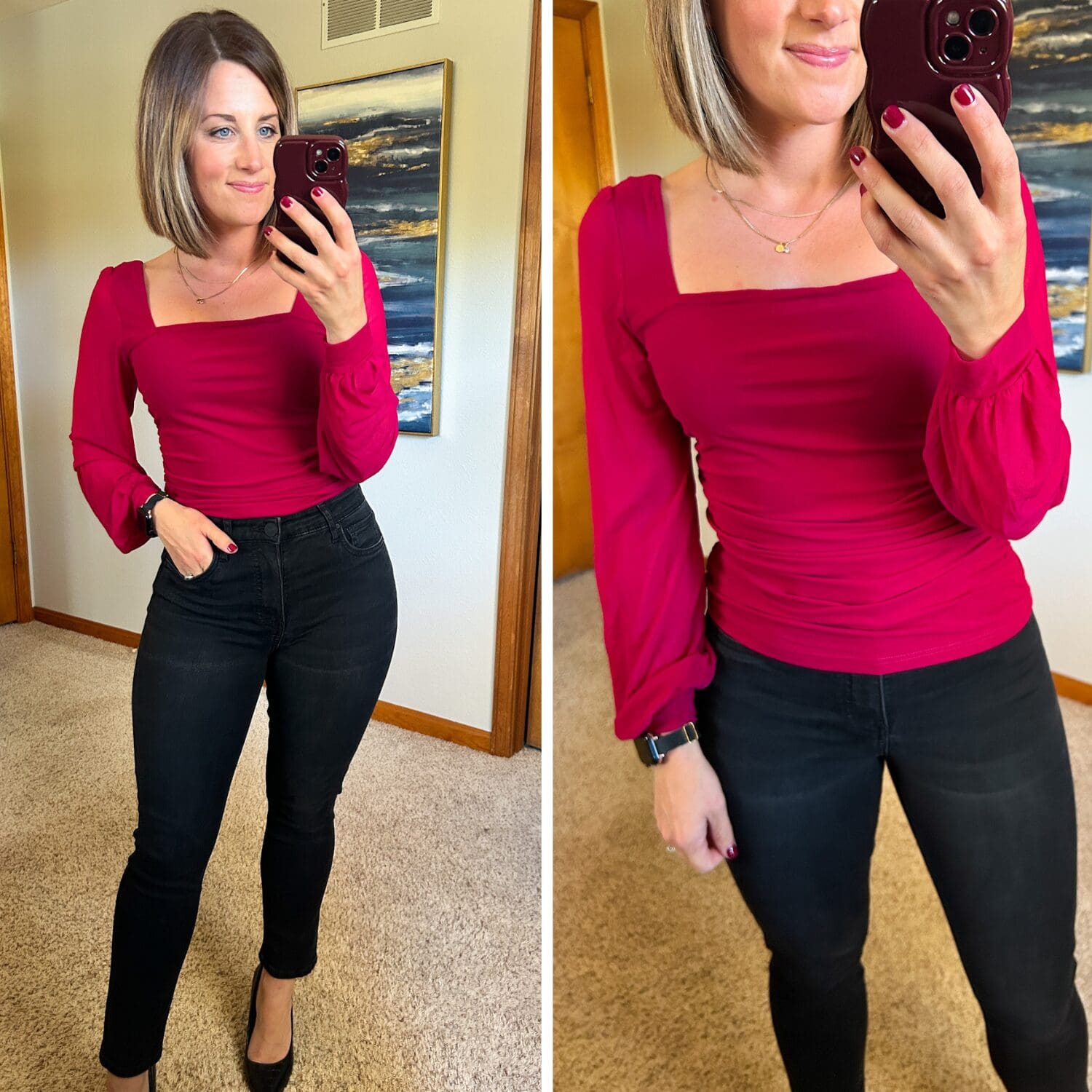 Square Neck Mesh Ruched Top [true to size, wearing in // Jeans [size down if in between] // Heels