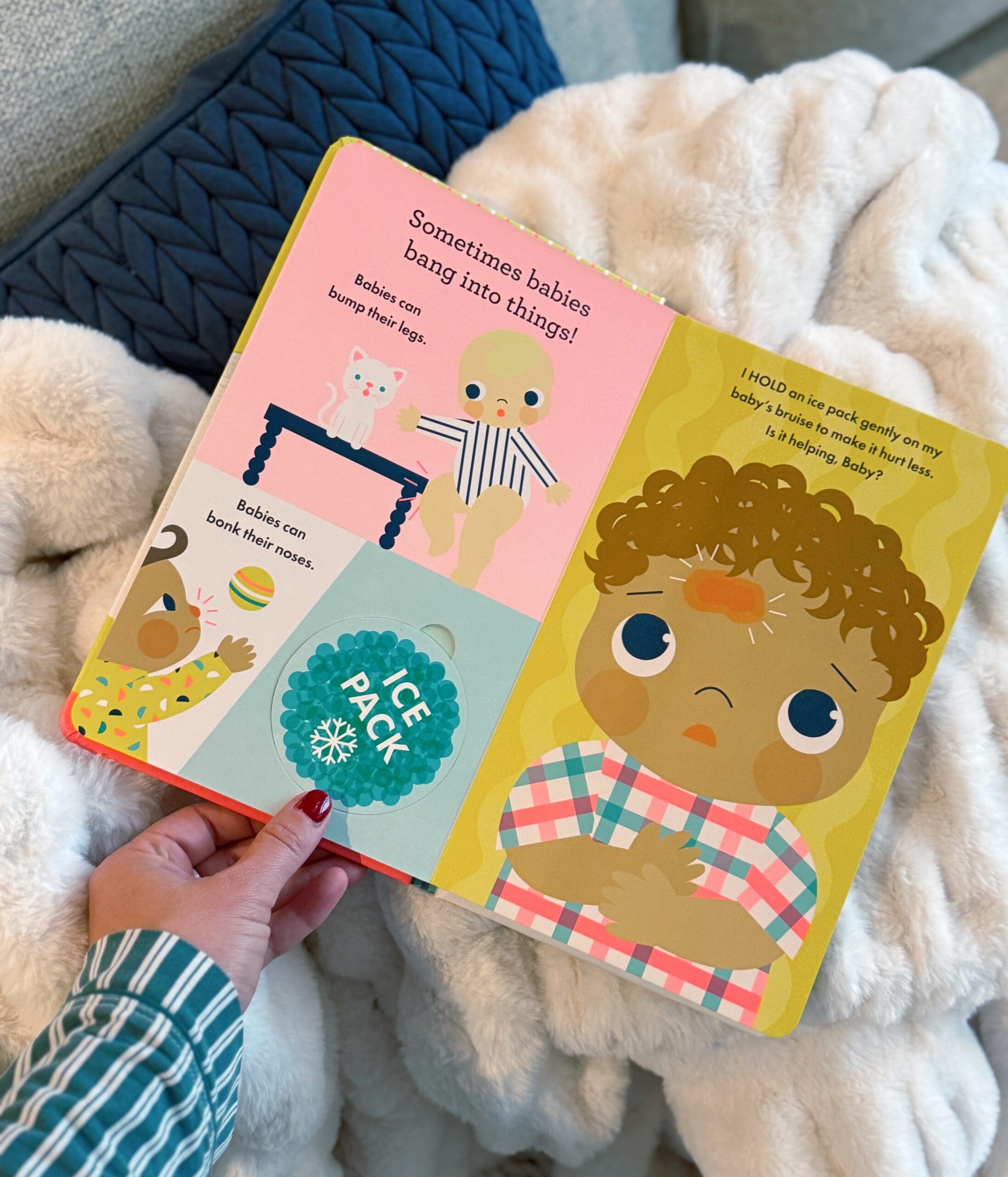 I just got this book in for Crew, and he absolutely loves it! Every page has a different way for him to interact with the book and help make the baby feel better! It’s a really cute and well-done book!