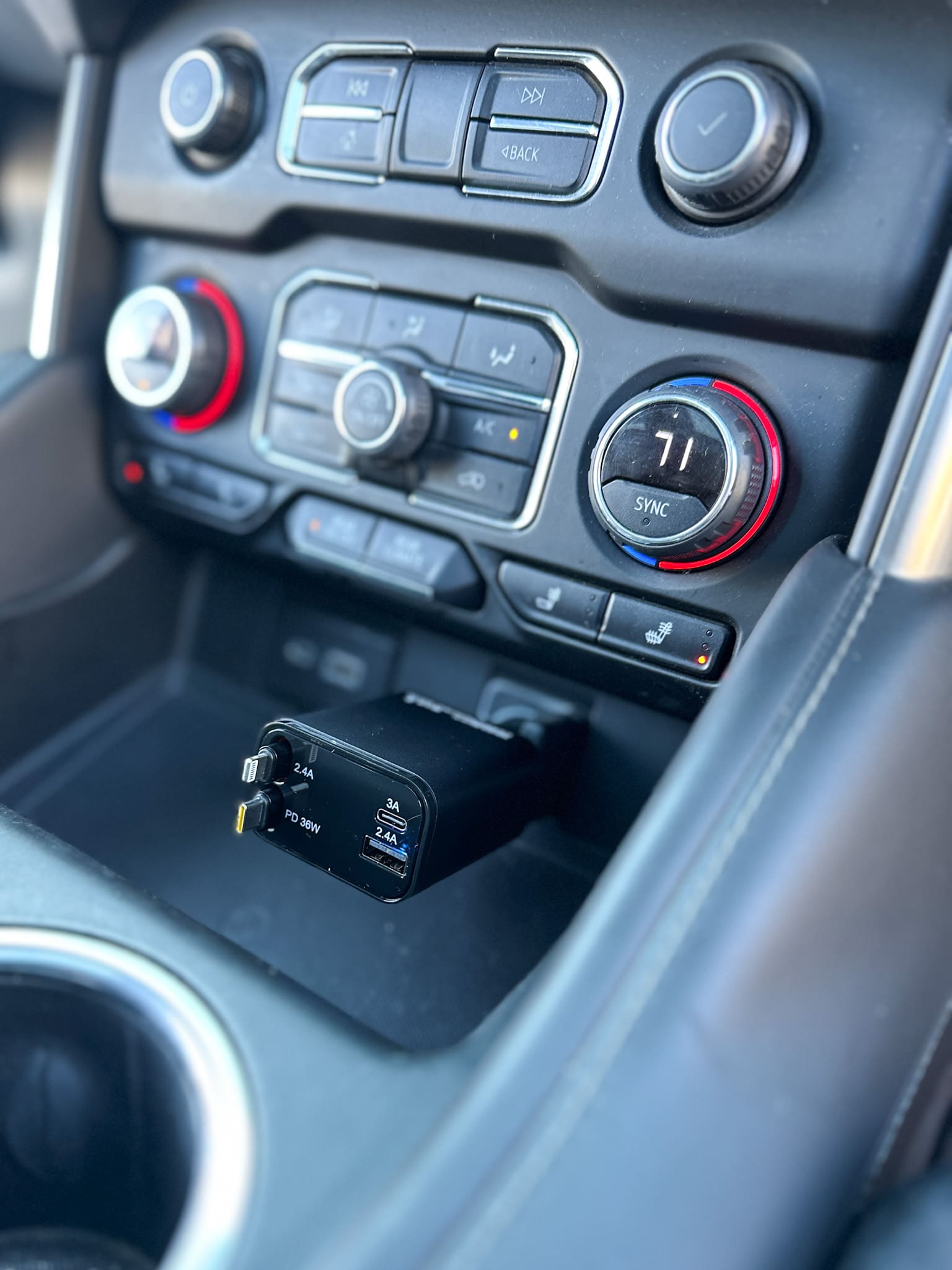 This simply charger plugs right into your car’s adaptor, with has chargers that pull out to reach as far as the back seat! It also has a spot for a USB plug in if needed!