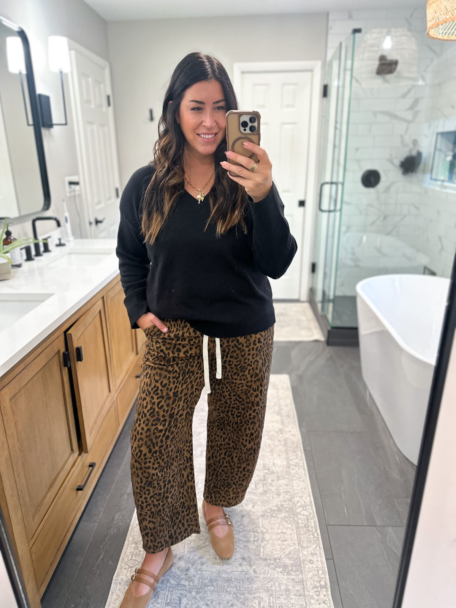 Amazon Leopard Pants [true to size, wearing in large in brown cheetah] // Loft Sweater [oversized, wearing in small] // Flats [true to size]