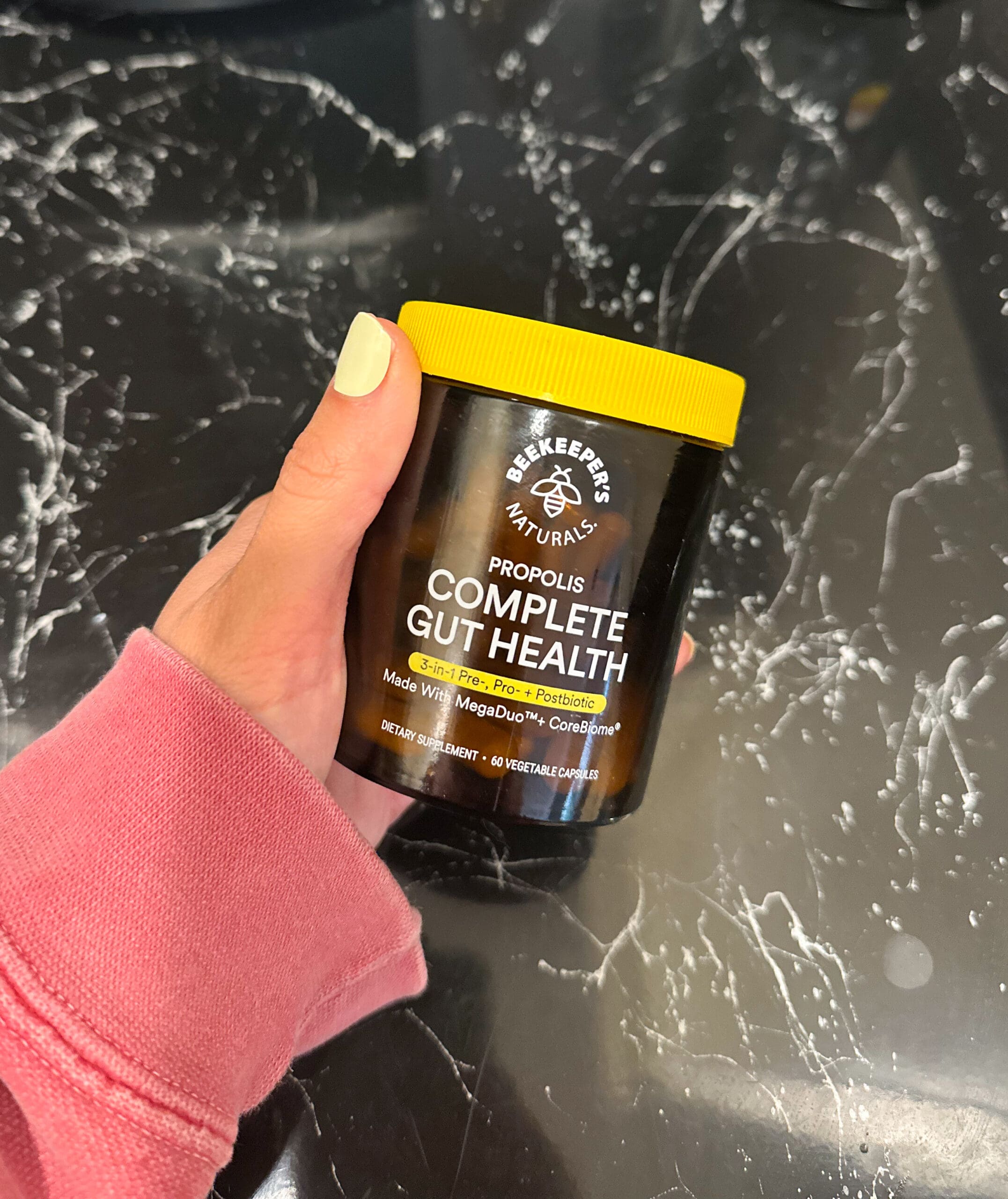 “Propolis acts as a prebiotic in Complete Gut Health to feed the good bacteria in the gut.” We love the beekeepers naturals brand for the immune sprays, so I wanted to give this 3 in 1 Prebiotic, Postbiotic, & Probiotics for gut health a shot as well and LOVE it! xo Katy