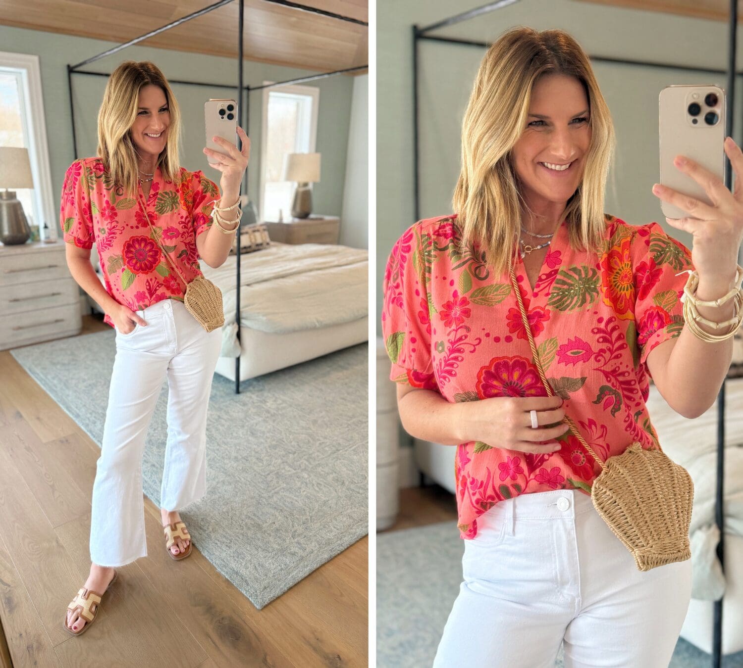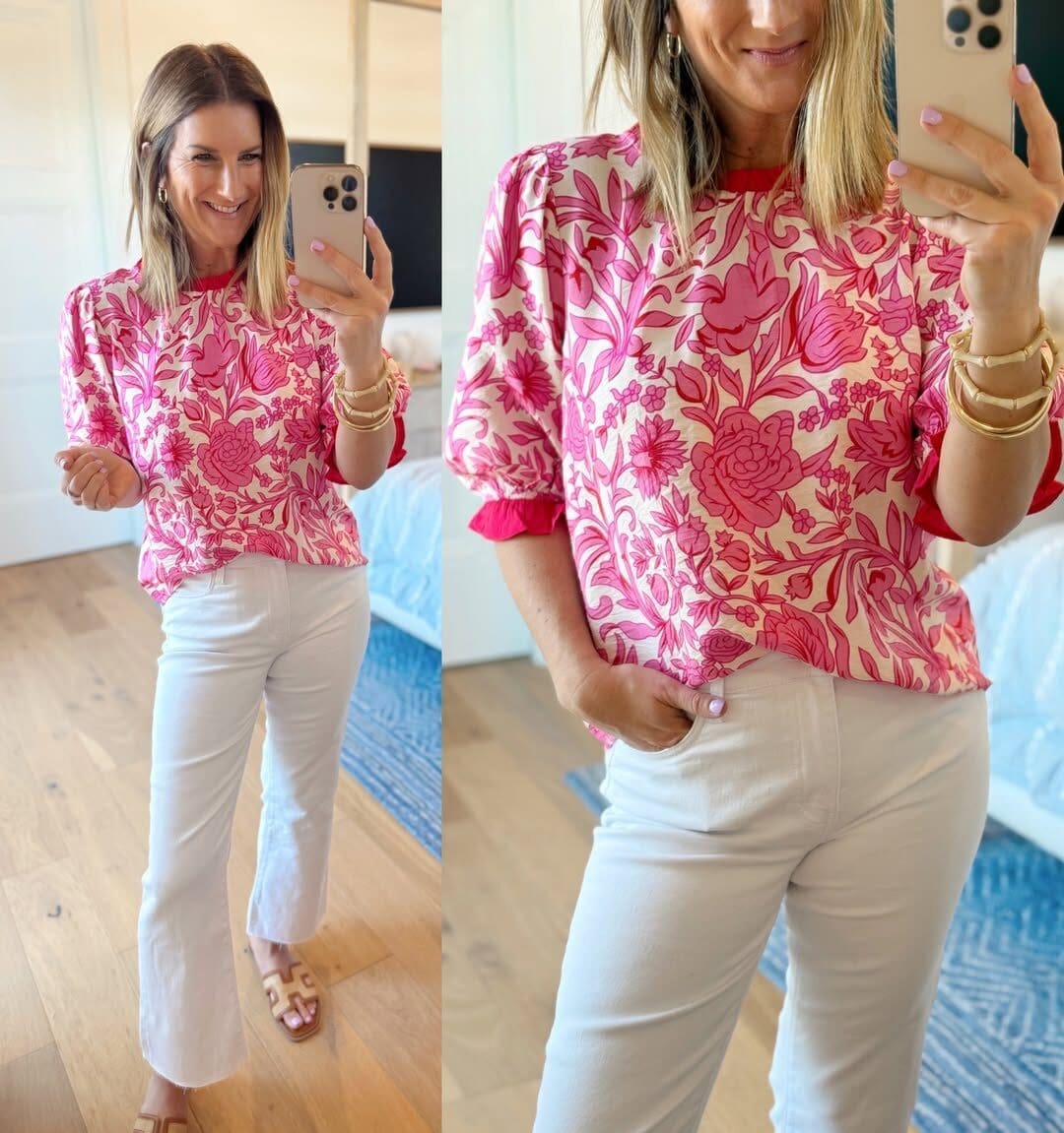 Floral Print Top // Kut from the Kloth Jeans // Sandals [true to size] // Seashell Crossbody // Bracelet Set // Use code YELLOW15 for 15% off!