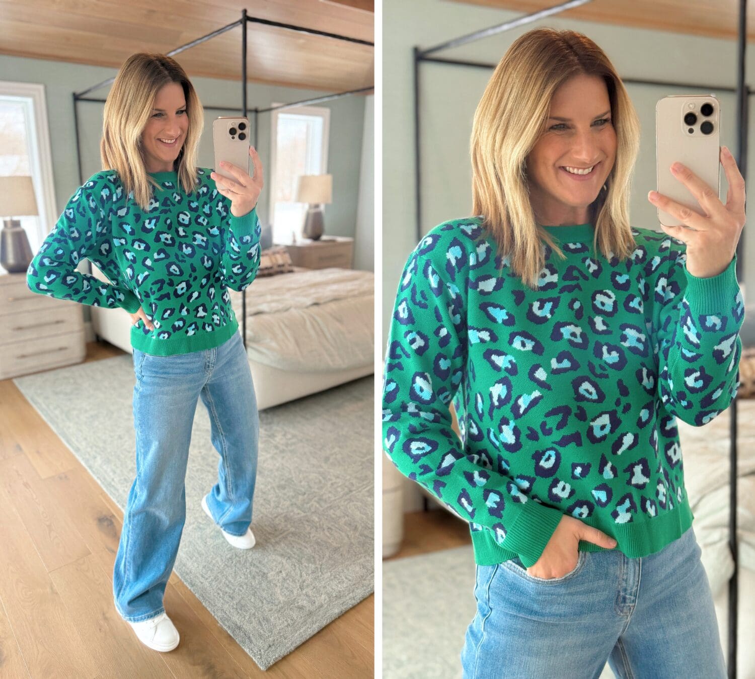 Leopard Sweater // Wide Leg Jeans // Sneakers // Use code YELLOW15 for 15% off!